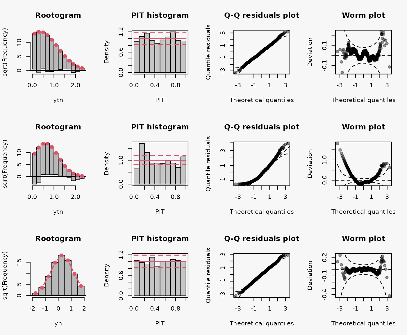 ## [inverse U-shaped PIT, inverse S-shaped QQ-plot, "fat tails" worm plot]